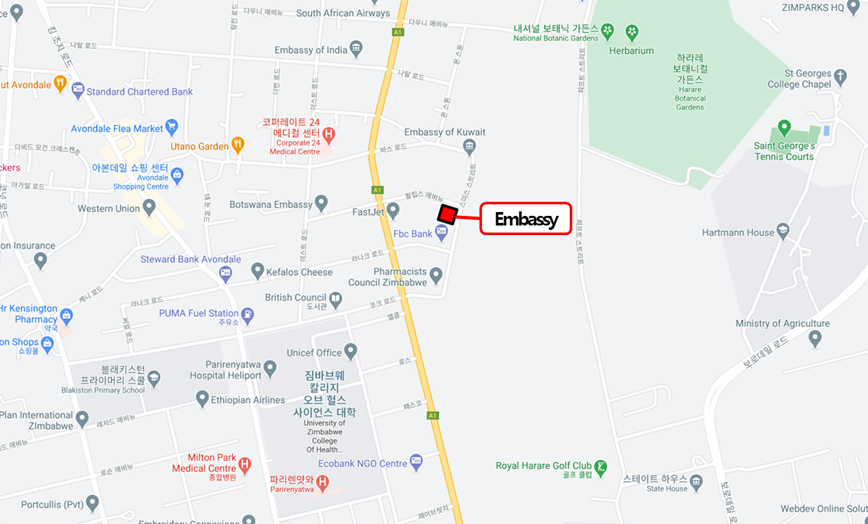 1 Phillips Avenue, Belgravia, Harare, Zimbabwe (P.O.B) Embassy of the Republic of Korea P.O.Box 4970, Harare, Zimbabwe